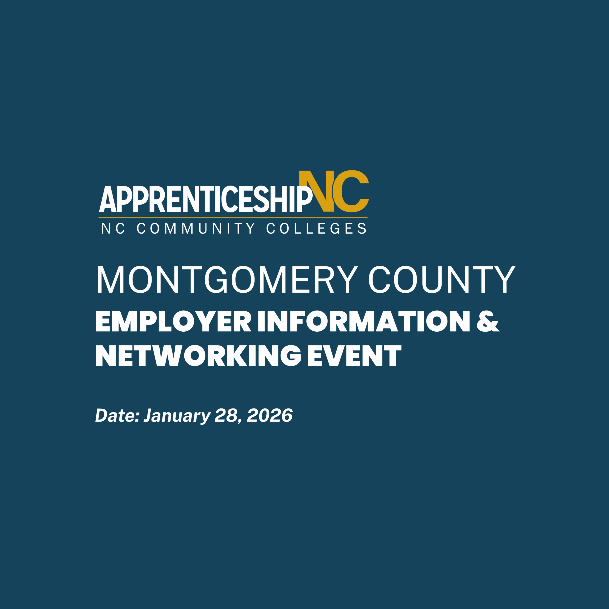 Join ApprenticeshipNC, Montgomery Community College, and more for an Employer Information & Networking Event focused on expanding Registered Apprenticeship—the gold standard in workforce training. This free event is a great opportunity to learn how successful Registered Apprenticeship Programs operate, explore strategies for engaging youth, and to connect with local ecosystem experts.