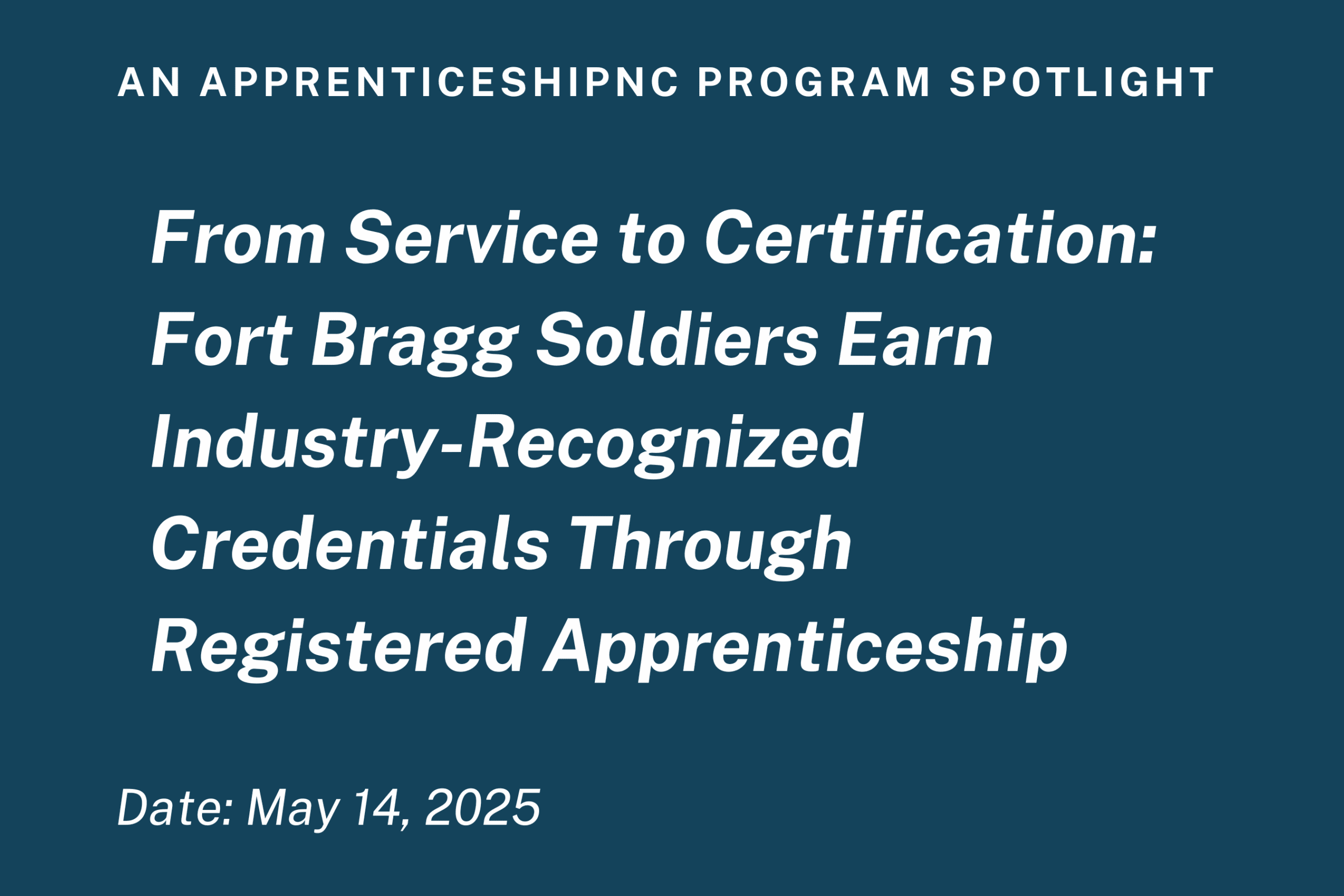 Fort Bragg Soldiers Earn Industry-Recognized Credentials Through Registered ApprenticeshipThe transition from military service to civilian life presents unique challenges. Veterans often experience changes in routine, lifestyle, finances, and difficulties navigating the civilian workforce. Recognizing these hurdles, ApprenticeshipNC, the State Apprenticeship Agency, partnered with Fort Bragg to establish a Registered Apprenticeship Program (RAP). Read More